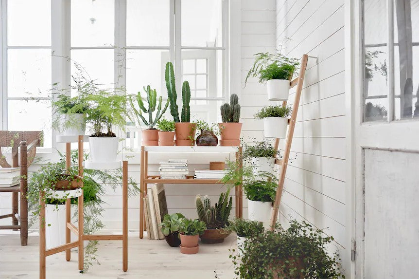 You can decorate with plants in a visually interesting way with shelves at different levels.