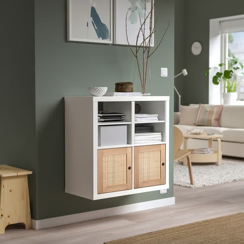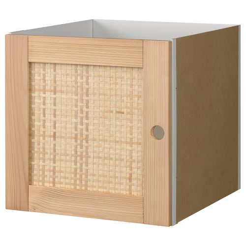 Use this insert to easily create a closed storage and give KALLAX shelving unit a new look. The door's frame in solid wood with a poplar weave in the middle spreads a warm and natural feel in the room.