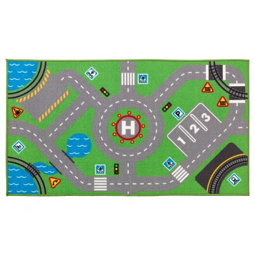 Honk and drive! On this rug there are roads, parking spaces, traffic signs and railroads – just like in a city.